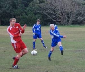 Even though Chas is approaching his 70th birthday, according to one of his team mates [who did not know who I was, nor that Chas is a friend of mine] did tell me that he is definitely not there just to make up numbers – he takes his place in the side, when selected, and makes his presence felt! I don't believe either his team-mates or opponents [all of whom, of course, he has known for a good few years] make any allowance for his age – his skill overcomes all! When I last saw him, he was trying desperately to shake off a slight injury because he wanted to play in the Charity Shield. He really relishes the chance to be playing regularly at least until this year when he will be 70. As this picture below shows [he's the one on the right], he's pretty active and the wimp in the red kit looks a little 'wary'!